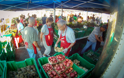 Worden Farm's (www.wordenfarm.com) (L - R) Rick and Doris Lovering, Philip Kemp and Carlos Mendes spends the entire day keeping stocks on the tables, educating customers about organic vegetables, and bagging organic leafy greens that were harvested the day before at the Saturday Morning Market, in St. Petersburg, FL on April 14, 2012. USDA Photo by Lance Cheung.