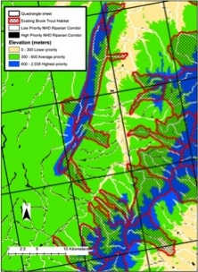 Riparian corridor areas in Virginia that are high priority (black = upper quartile of solar gain and less than 70% canopy cover) for riparian restoration to mitigate water temperature increases. Brook trout priority areas are defined by elevation gradients (0-300 m low priority; 300 – 600m average priority; > 600m high priority). Cross hatched polygons represent existing brook trout habitats. Blue and green elevation gradients represent potential cold water brook trout habitat.